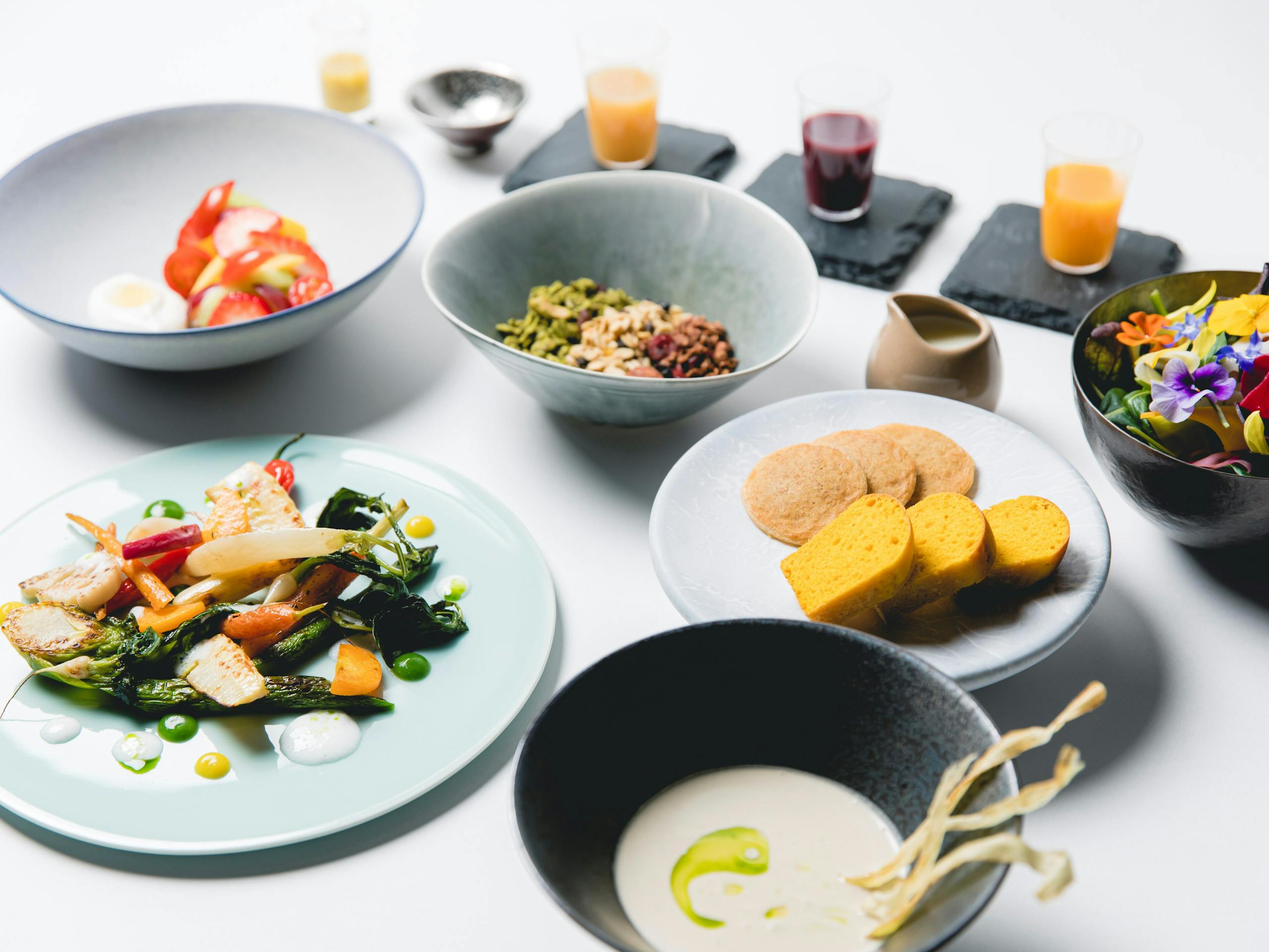 朝食はフロントロビーの隣にある「眞蔵(シングラー)」で頂きます。自然光をメインに据えた適度な明るさは、目の覚めきらない体に丁度良い照度です。くすみのある金、木材、石材といった色・材質の違う部材を組み合わせた店内は違和感なく調和しています。